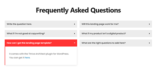 Frequently Asked Questions Write the question here. Write the answer to the question here. This way, your visitors can easily pick the questions that matter to them, without being distracted by loads of text from the FAQ. What if I’m not good at copywriting? The text in this landing page gives you a lot of …