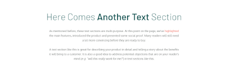 Here Comes Another Text Section As mentioned before, these text sections are multi-purpose. At this point on the page, we’ve highlighted the main features, introduced the product and presented some social proof. Many readers will still need a lot more convincing before they are ready to buy.A text section like this is great for describing …