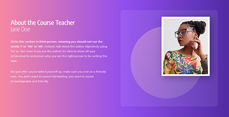 About the Course TeacherJane DoeWrite this section in third-person, meaning you should not use the words ‘I’ or ‘We’ or ‘Me’. Instead, talk about the author objectively using ‘he’ or ‘she’ even if you are the author! It’s time to show off your achievements and prove why you are the right person to be writing …