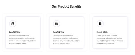 Our Product Benefits Benefit 1 TitleLorem ipsum dolor sit amet, consectetur adipisicing elit, sed do eiusmod tempor incididunt ut labore et dolore magna aliqua. Benefit 2 TitleLorem ipsum dolor sit amet, consectetur adipisicing elit, sed do eiusmod tempor incididunt ut labore et dolore magna aliqua. Benefit 3 TitleLorem ipsum dolor sit amet, consectetur adipisicing elit, …