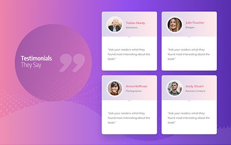 Testimonials They Say Tobias HardyMarketeer “Ask your readers what they found most interesting about the book.” Julie FoucherBlogger “Ask your readers what they found most interesting about the book.” Anna HoffmanPhotographer “Ask your readers what they found most interesting about the book.” Andy StuartBusiness Analyst “Ask your readers what they found most interesting about the …