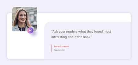 “ “Ask your readers what they found most interesting about the book.” Anna StewartMarketeer __CONFIG_group_edit__{}__CONFIG_group_edit__ __CONFIG_local_colors__{“colors”:{},”gradients”:{}}__CONFIG_local_colors__ “ “Ask your readers what they found most interesting about the book.” Anna Stewart Marketeer