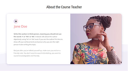 About the Course Teacher Jane DoeWrite this section in third-person, meaning you should not use the words ‘I’ or ‘We’ or ‘Me’. Instead, talk about the author objectively using ‘he’ or ‘she’ even if you are the author! It’s time to show off your achievements and prove why you are the right person to be …
