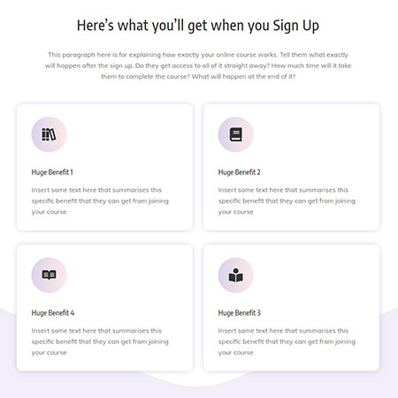 Here’s what you’ll get when you Sign UpThis paragraph here is for explaining how exactly your online course works. Tell them what exactly will happen after the sign up. Do they get access to all of it straight away? How much time will it take them to complete the course? What will happen at the …