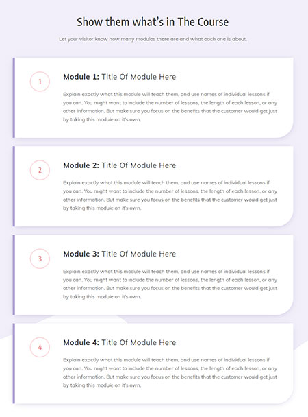 Show them what’s in The CourseLet your visitor know how many modules there are and what each one is about. 1Module 1: Title Of Module HereExplain exactly what this module will teach them, and use names of individual lessons if you can. You might want to include the number of lessons, the length of each lesson, …