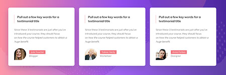 Pull out a few key words for a testimonial title Since these 3 testimonials are just after you’ve introduced your course, they should focus on how the course helped customers to obtain a huge benefit.Julie FoucherBlogger Pull out a few key words for a testimonial title Since these 3 testimonials are just after you’ve introduced your …