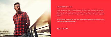 MARC JACOBS // AuthorIn this section, introduce the author, creator, teacher or face of the brand. Help your audience connect with you on a more personal level and show them that there’s a person behind it. It feels better to buy from a person than from a faceless, corporate brand. You don’t need to tell your life …