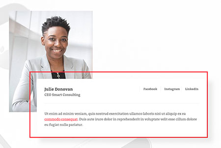 Julie DonovanCEO Smart Consulting Ut enim ad minim veniam, quis nostrud exercitation ullamco laboris nisi ut aliquip ex ea commodo consequat. Duis aute irure dolor in reprehenderit in voluptate velit esse cillum dolore eu fugiat nulla pariatur. __CONFIG_group_edit__{}__CONFIG_group_edit__ __CONFIG_local_colors__{“colors”:{},”gradients”:{}}__CONFIG_local_colors__ Julie Donovan CEO Smart Consulting Ut enim ad minim veniam, quis nostrud exercitation ullamco laboris nisi …