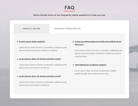 FAQWe’ve shared some of our frequently asked questions to help you out. product delivery warranty & registration Auctor ipsum dolor sagittis?Lorem ipsum dolor sit amet, consectetur adipisicing elit, sed do eiusmod tempor incididunt ut labore. Lorem ipsum dolor sit veniam pariatur amet?Lorem ipsum dolor sit amet, consectetur adipisicing elit, sed do eiusmod tempor incididunt. Lorem …
