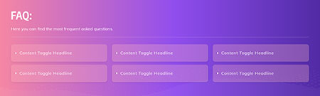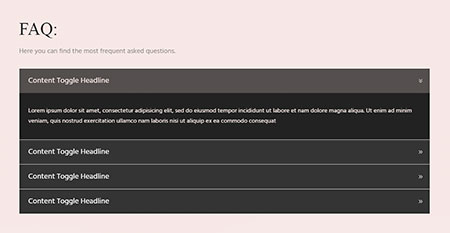 FAQ: Here you can find the most frequent asked questions. Content Toggle Headline Lorem ipsum dolor sit amet, consectetur adipisicing elit, sed do eiusmod tempor incididunt ut labore et nam dolore magna aliqua. Content Toggle Headline Lorem ipsum dolor sit amet, consectetur adipisicing elit, sed do eiusmod tempor incididunt ut labore et nam dolore magna aliqua. …