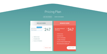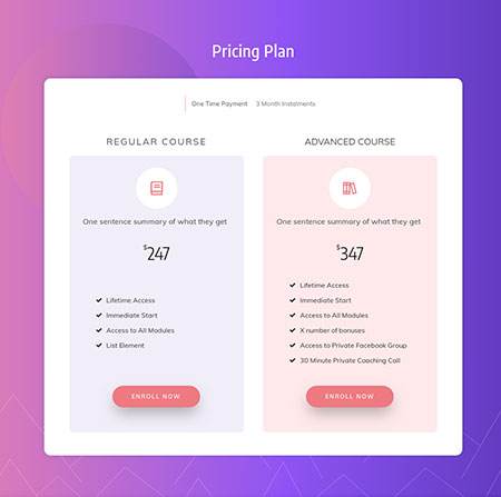 Pricing Plan One Time Payment 3 Month Instalments regular course One sentence summary of what they get $247 Lifetime AccessImmediate StartAccess to All ModulesList Element enroll now advanced course One sentence summary of what they get $347 Lifetime AccessImmediate StartAccess to All ModulesX number of bonusesAccess to Private Facebook Group30 Minute Private Coaching Call enroll …