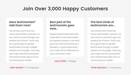 Join Over 3,000 Happy Customers More testimonials? Add them here!You almost can’t have too many testimonials. However, no one wants to read through one endless list of them. That’s why it’s a good idea to spread testimonials through multiple sections on the page. That way, your copy and the social proof from testimonials take turns …