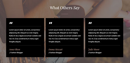 What Others Say “Lorem ipsum dolor sit amet, consectetur adipiscing elit. Aliquam ac erat magna. Nulla et dui a ligula accumsan sodales sed nec mi. Cras condimentum metus eget fringilla aliquet.Anna Olson / Fashion Blogger “Lorem ipsum dolor sit amet, consectetur adipiscing elit. Aliquam ac erat magna. Nulla et dui a ligula accumsan sodales sed …