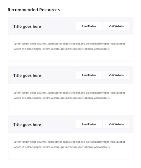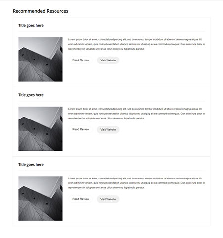 Recommended Resources Title goes here Read Review Visit Website Lorem ipsum dolor sit amet, consectetur adipisicing elit, sed do eiusmod tempor incididunt ut labore et dolore magna aliqua. Ut enim ad minim veniam, quis nostrud exercitation ullamco laboris nisi ut aliquip ex ea commodo consequat. Duis aute irure dolor in reprehenderit in voluptate velit esse …