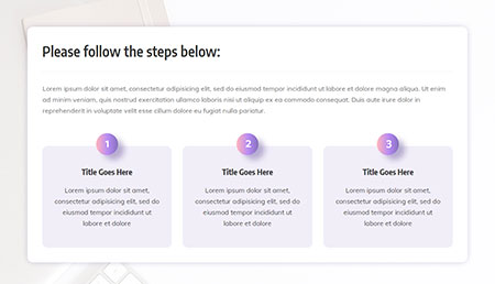 Please follow the next steps: 1Title Goes HereLorem ipsum dolor sit amet, consectetur adipisicing elit, sed do eiusmod tempor incididunt ut labore et dolore.2Title Goes HereLorem ipsum dolor sit amet, consectetur adipisicing elit, sed do eiusmod tempor incididunt ut labore et dolore.3Title Goes HereLorem ipsum dolor sit amet, consectetur adipisicing elit, sed do eiusmod tempor …