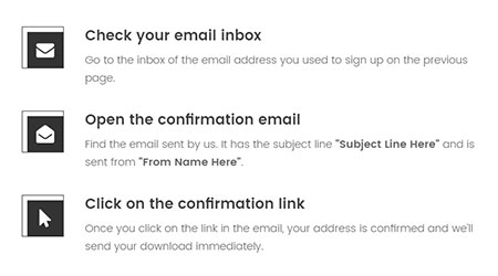 envelope Check your email inboxGo to the inbox of the email address you used to sign up on the previous page. envelope-open Open the confirmation emailFind the email sent by us. It has the subject line “Subject Line Here” and is sent from “From Name Here”. mouse-pointer Click on the confirmation linkOnce you click on the link in …
