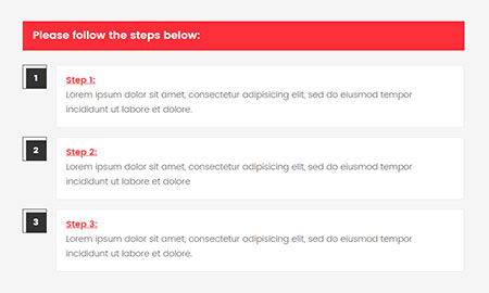 Please follow the steps below: 1Step 1:Lorem ipsum dolor sit amet, consectetur adipisicing elit, sed do eiusmod tempor incididunt ut labore et dolore.2Step 2:Lorem ipsum dolor sit amet, consectetur adipisicing elit, sed do eiusmod tempor incididunt ut labore et dolore3Step 3:Lorem ipsum dolor sit amet, consectetur adipisicing elit, sed do eiusmod tempor incididunt ut labore …