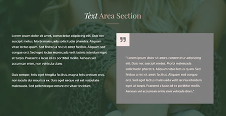 Text Area Section Lorem ipsum dolor sit amet, consectetur adipiscing elit. Duis nec suscipit metus. Morbi malesuada sollicitudin pharetra. Aliquam vitae lectus quam. Sed finibus a nisi sit amet facilisis. Aliquam sed congue orci. Sed eget lectus malesuada velit lacinia interdum eget at turpis. Praesent a lacus id ex porttitor mollis. Aenean vel accumsan enim, …