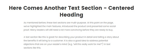 Here Comes Another Text SectionAs mentioned before, these text sections are multi-purpose. At this point on the page, we’ve highlighted the main features, introduced the product and presented some social proof. Many readers will still need a lot more convincing before they are ready to buy.A text section like this is great for describing your …