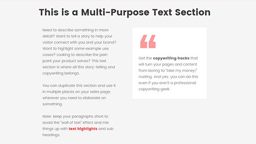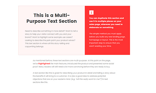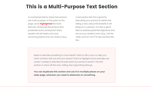 This is a Multi-Purpose Text SectionAs mentioned before, these text sections are multi-purpose. At this point on the page, we’ve highlighted the main features, introduced the product and presented some social proof. Many readers will still need a lot more convincing before they are ready to buy.A text section like this is great for describing …