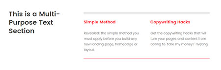 This is a Multi-Purpose Text SectionSimple MethodRevealed: the simple method you must apply before you build any new landing page, homepage or layout.Copywriting HacksGet the copywriting hacks that will turn your pages and content from boring to “take my money!” riveting. __CONFIG_group_edit__{}__CONFIG_group_edit__ __CONFIG_local_colors__{“colors”:{},”gradients”:{}}__CONFIG_local_colors__ This is a Multi-Purpose Text Section Simple Method Revealed: the simple method …