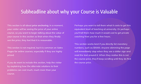 Subheadline about why your Course is Valuable This section is all about price anchoring. In a moment, your visitor will be seeing the price of your online course, so you want to begin talking about the value of your course in this section so that when they finally see the price, they feel that it …